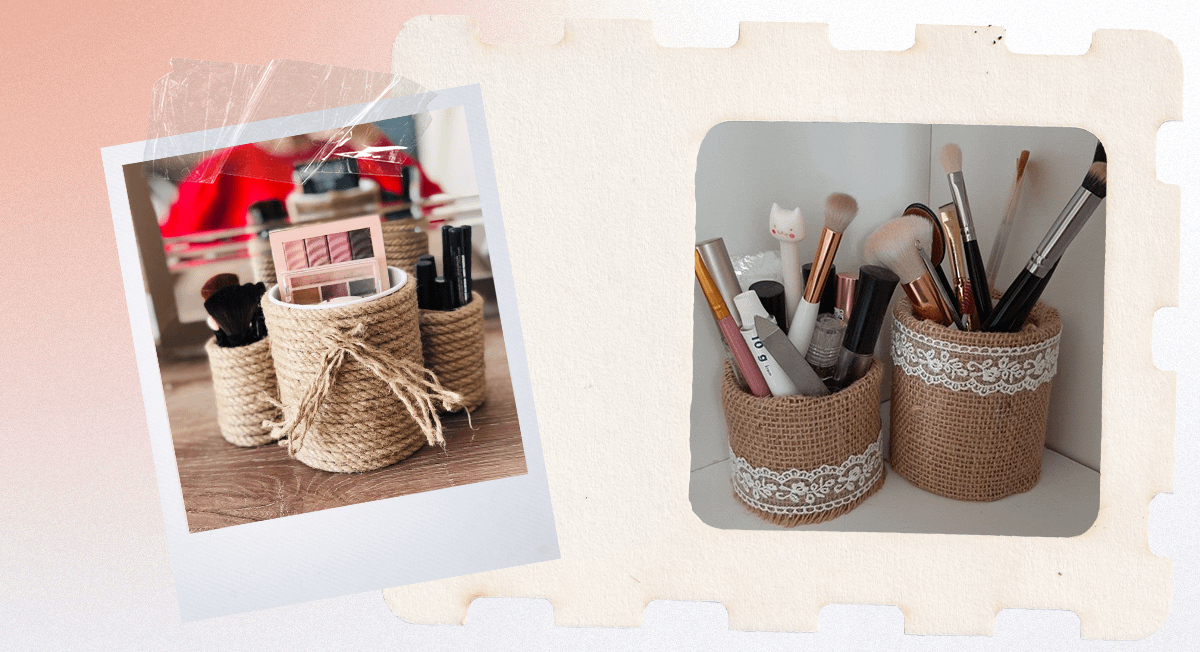 Баночки и коробки можно декорировать тканью, бечевкой или яркой бумагой и использовать для хранения кистей, спонжей и аппликаторов. Разделение по типу кистей поможет быстрее находить нужную для макияжа.