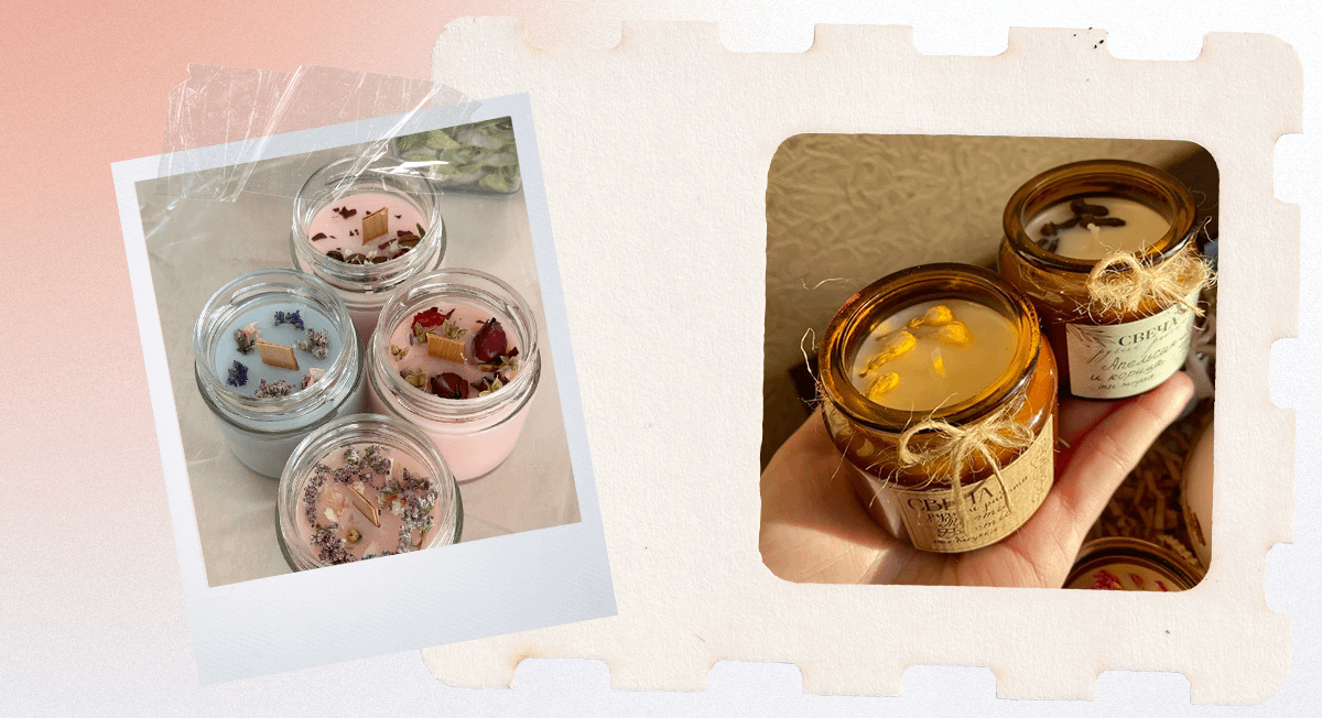 Пустую и чистую баночку можно наполнить воском, добавить ароматическое масло и украсить цветами или блестками. Получится стильный декоративный элемент, который можно поставить на стол, полку или использовать в качестве подарка.