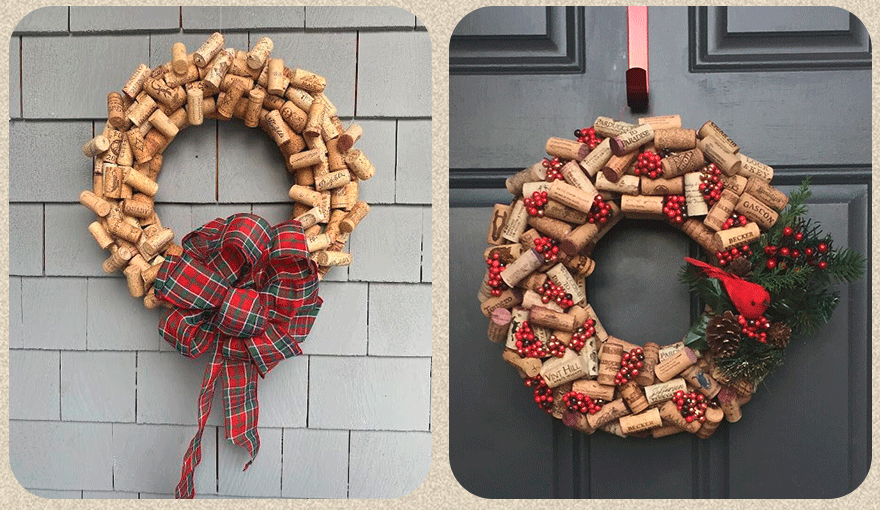 Чтобы сделать праздничный венок, вырежи из плотного картона основу в форме бублика. Хаотично или в рядочек при помощи клея закрепи на основу винные пробки. Чем больше их у тебя найдется, тем лучше. Придать венку яркости можно при помощи красных лент или других ярких украшений. Например, алых бусинок, еловой ветки или текстильного банта.