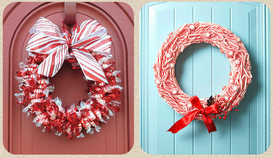 Кстати, сделать необычный венок можно и из лакричных леденцов в виде тросточек. Идеально для такого украшения подойдет круглая основа из плотной проволоки.