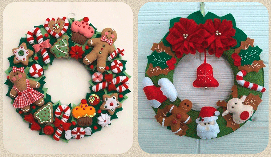 Если ты умеешь работать с фетром, попробуй смастерить из этого материала новогодний венок. В сети ты можешь найти разнообразные выкройки рождественских персонажей, которые украсят его.