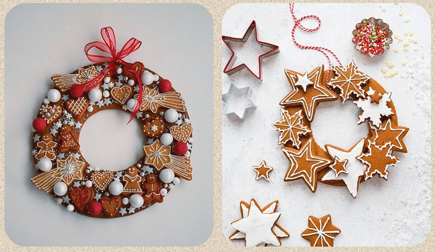 Чтобы сделать такой венок, приготовь круглую основу из печенья, на которую потом сможешь при помощи густого крема закрепить форменные съедобные украшения. В качестве дополнительного декора используй корицу и разноцветные ленты.