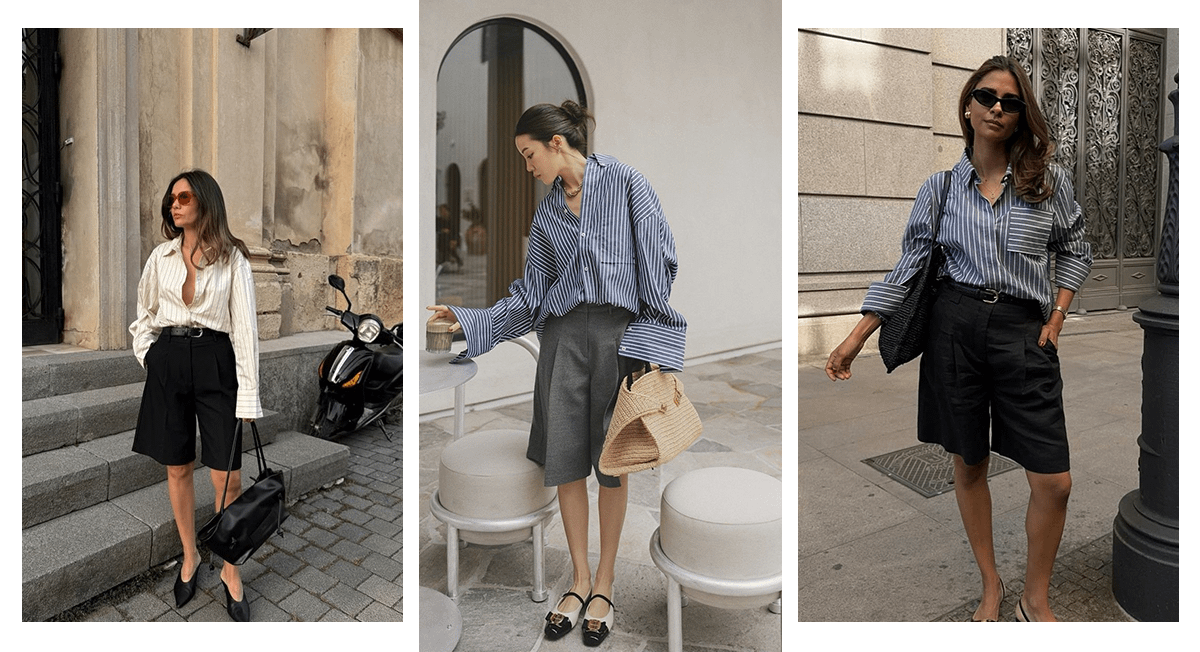 3. Классические бермуды, блузка в полоску и макси-сумка