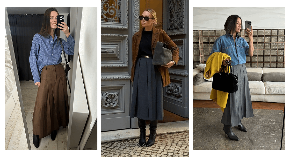 Серые, темно-синие и черные юбки плиссе — один из главных модных трендов этой осени, к тому же они идеальны для офиса. Носить вещь советуем с классическими рубашками из натуральных тканей и плотного денима. Утеплиться и почувствовать себя более комфортно поможет оверсайз-жакет из плотной ткани.