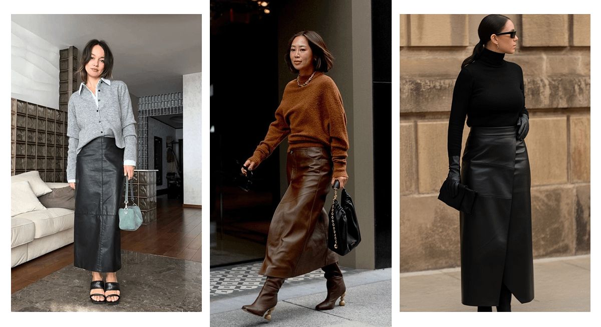 Коричневые, бордовые и черные кожаные юбки, особенно прямые и удлиненные, — мастхэв этой осени. Вещь идеально сочетается не только с блузками, но и с трикотажными кофтами, в том числе поло с удлиненными рукавами. Высокие сапоги помогут визуально вытянуть образ, а объемная сумка — сделать его более практичным.