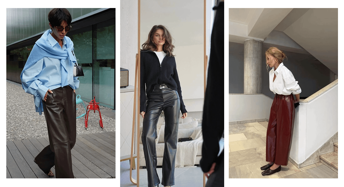 Осень — идеальное время, чтобы добавить в гардероб кожаные брюки. Правда, если раньше в моде были узкие модели, то теперь — свободного кроя. Брюки в темных цветах, в том числе бордовом и сером, идеальны для офиса с не слишком строгим дресс-кодом. Сочетать вещь советуем с базовой голубой или белой блузкой, а также классическими лоферами или балетками. В холодный день поверх блузки можно накинуть жакет или кофту на молнии.