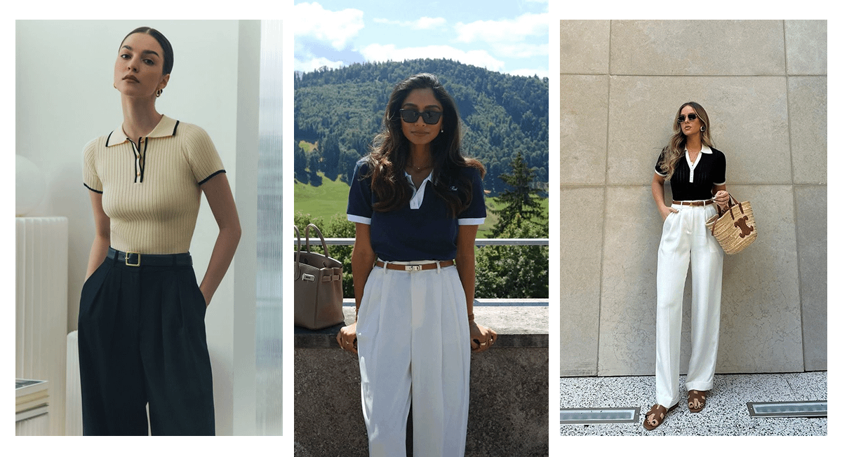 Если погода позволяет, замени трикотажную кофту поло с короткими рукавами. Изделие отлично сочетается с классическими брюками — как прямыми, так и обтягивающими. Подчеркнуть женственность тебе поможет тонкий кожаный ремень. Его цвет может как совпадать с цветом брюк, так и контрастировать с ним.