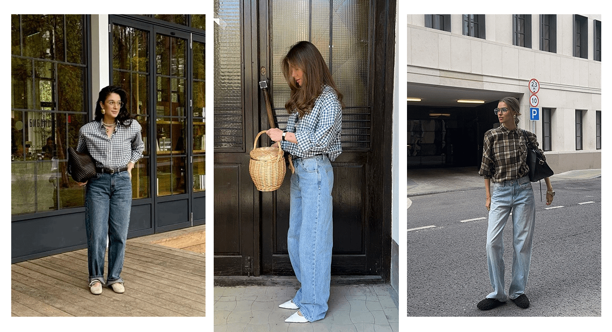4. Джинсы свободного кроя, рубашка в клетку и массивные украшения