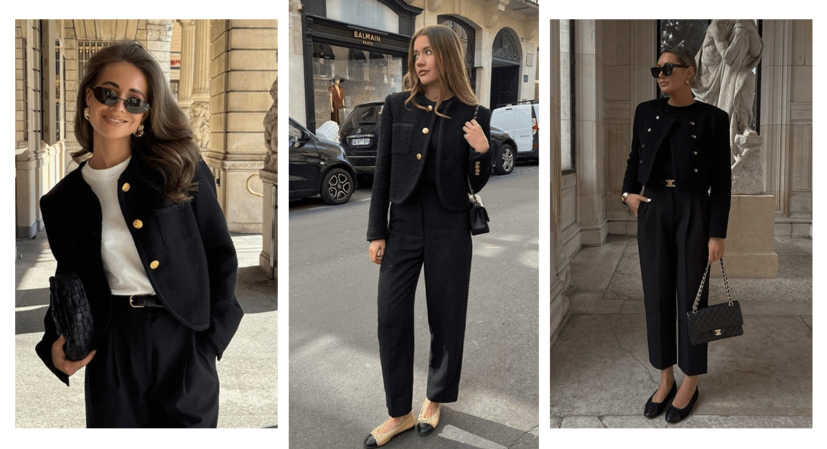9. Черные брюки, жакет в стиле Chanel и сумка на цепочке