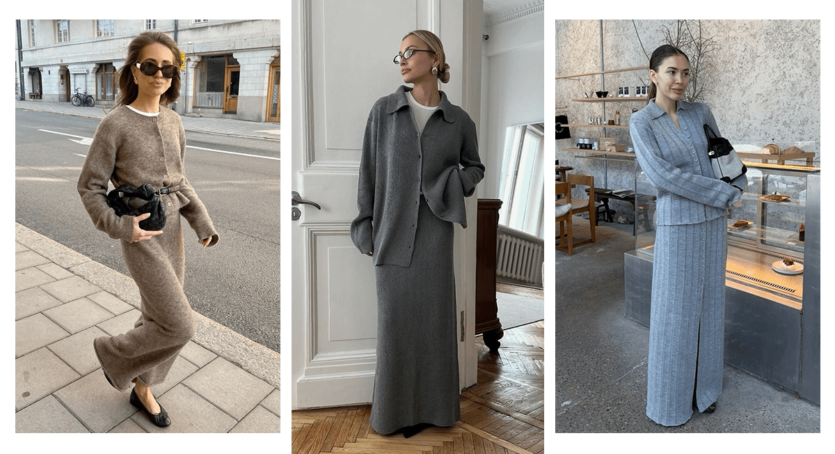 Самые модные в этом сезоне — трикотажные костюмы с юбкой в пол и жакетом на пуговицах. Комплект уместно выглядит как в офисе, так и в ресторане, поэтому считается универсальным. Если хочется выглядеть более уютно, под жакет советуем надеть однотонную майку, а полусапоги на каблуках заменить лоферами.