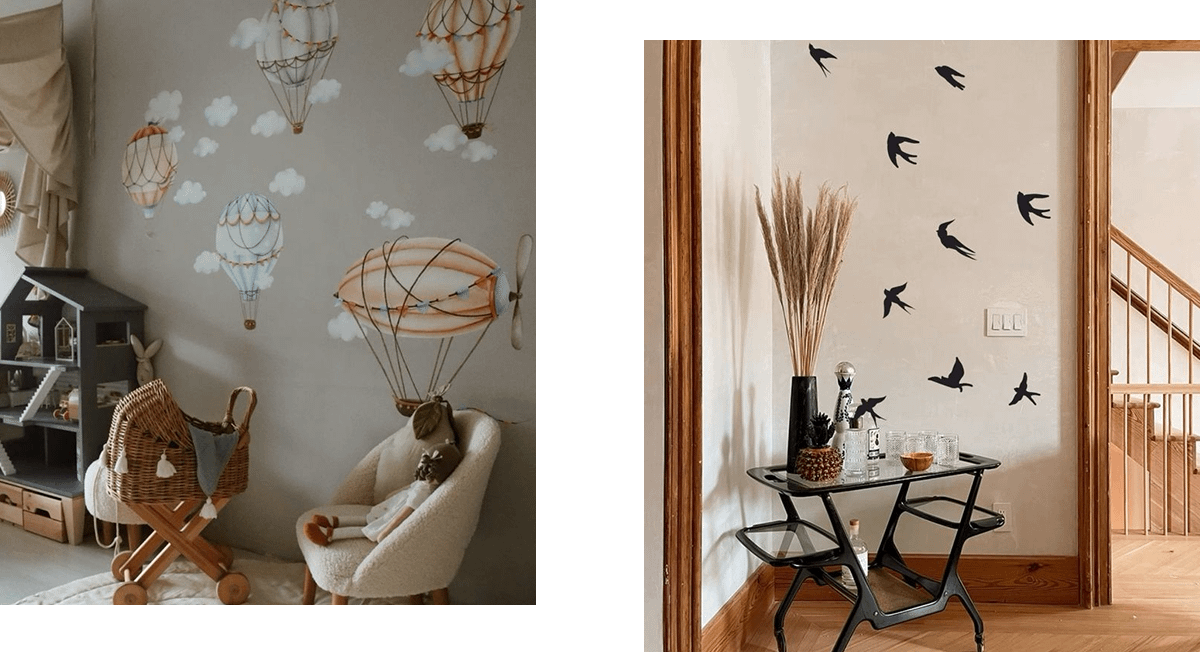 Это один из самых быстрых и недорогих способов преобразить пустые стены. Виниловые наклейки можно купить в магазинах для дома и на маркетплейсах. Ты легко сможешь найти сюжет, который покажется наиболее интересным и подходящим под основной интерьер.