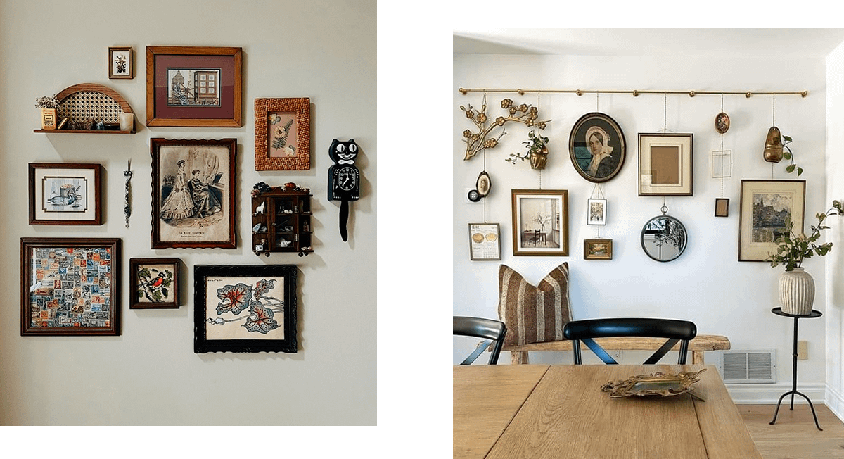 Распечатай любые фотографии и картины известных художников в разных форматах. Подбери подходящие по стилю рамки и дополни ими пространство. Добавь еще несколько акцентных деталей: маленькое зеркало, сухоцветы, изящные светильники.