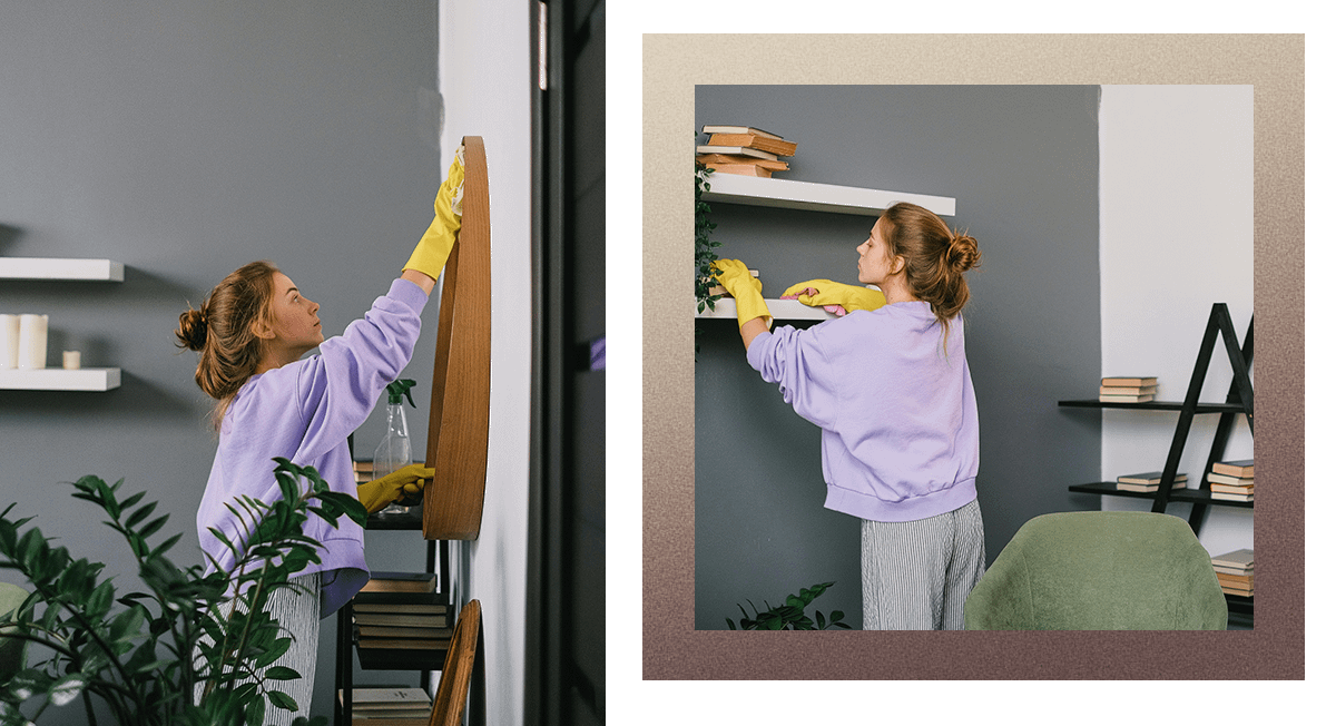 Чтобы сэкономить время, используй очиститель для воздуха. Также не забывай включать вытяжку на кухне, когда готовишь, и в ванной — после того, как примешь душ. Проводить влажную уборку вручную лучше сверху вниз.