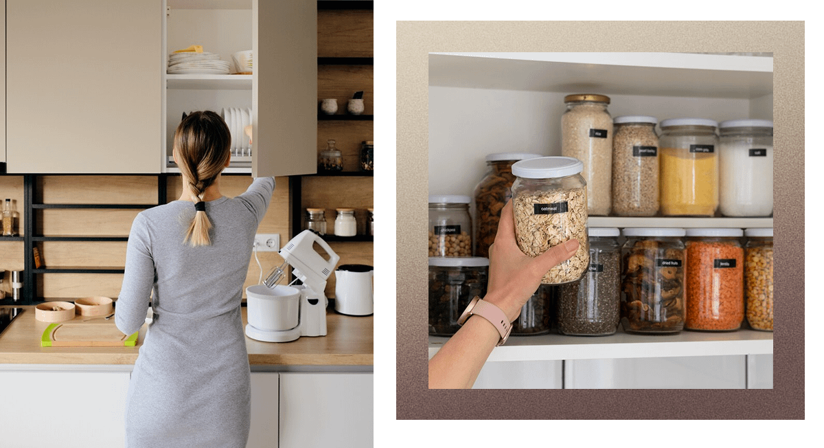 Используй специальные разделители для ящиков, чтобы появилось дополнительное место для хранения. Купи качественные банки для разных круп, специй, чая и кофе. Подпиши их и убери на полку так, чтобы было просто дотягиваться до продуктов, которые используешь чаще всего. Еще несколько идей от экспертов можешь найти здесь.