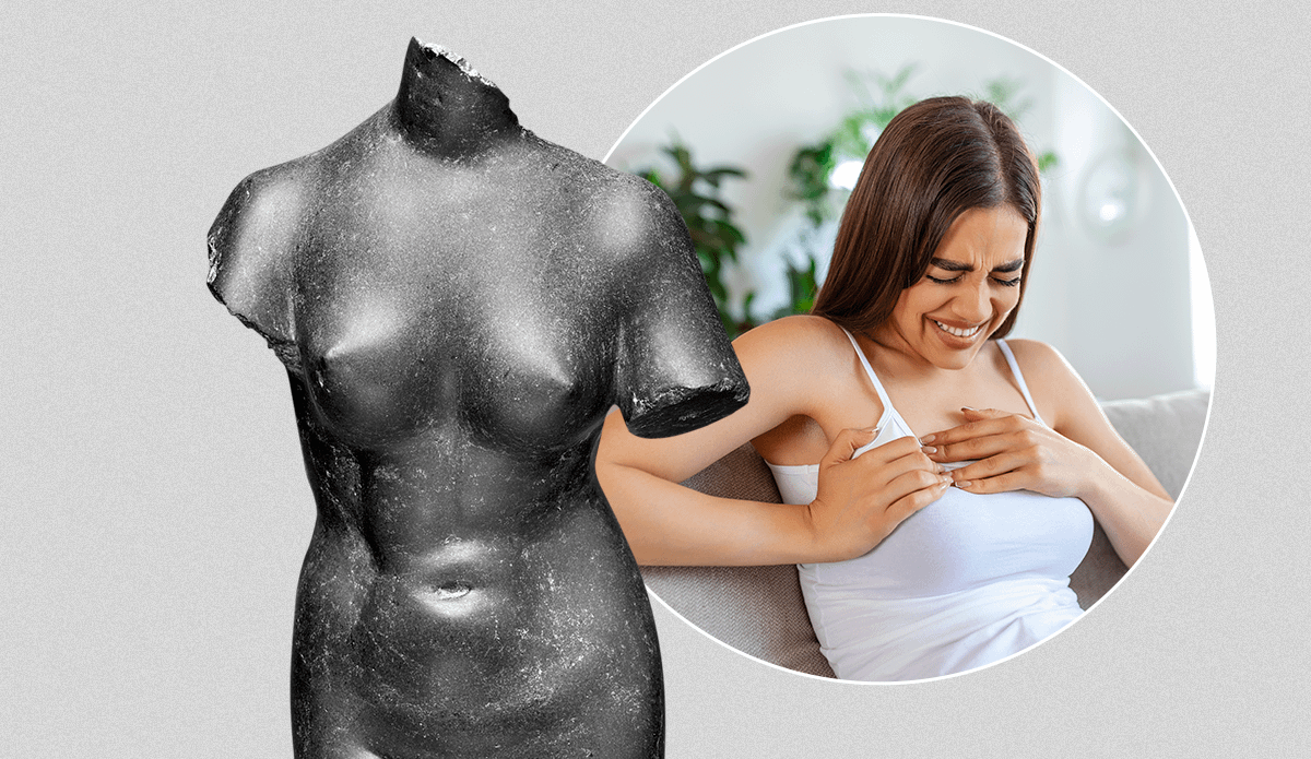 Изменение цвета и текстуры кожи груди связывают с тем, что раковые клетки блокируют работу лимфатической системы и сосудов. Со временем к этому неприятному симптому рака присоединятся другие: ухудшится общее самочувствие, появятся боли в груди, усилится слабость в течение дня.