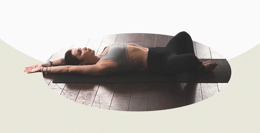 Подложи под туловище подушку, а под голову валик или скрученное полотенце. Ляг на спину и вытяни ноги. Затем согни ноги в коленях и разведи их в стороны. Ступни при этом должны плотно прилегать друг к другу. Расслабь руки и вытяни их вдоль тела так, чтобы ладони смотрели вверх. Закрой глаза, расслабься и в течение 3-5 минут задержись в этой позе. Дыхание при этом должно оставаться умеренным. Повтори упражнение 2-3 раза, чтобы закрепить результат.