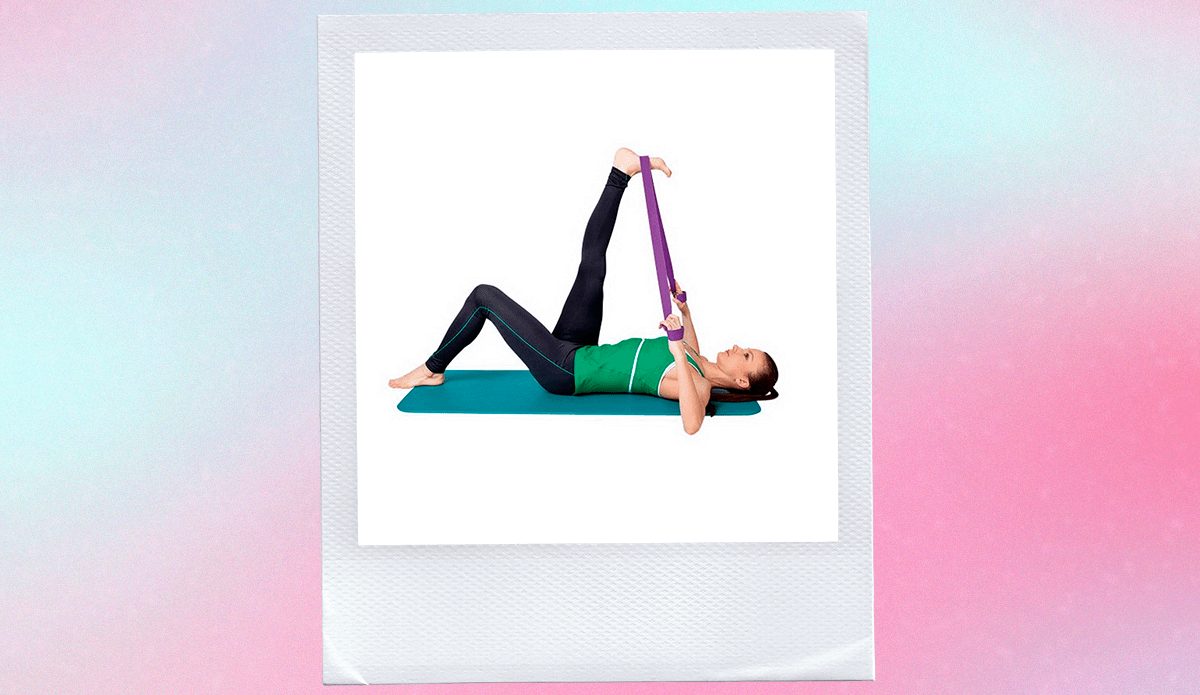 Ляг на спину, правую ногу вытяни вперед, а левую согни в колене. Накинь ленту-эспандер на середину правой ступни и зажми ее концы в руках.
