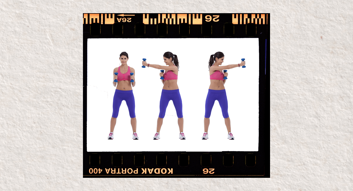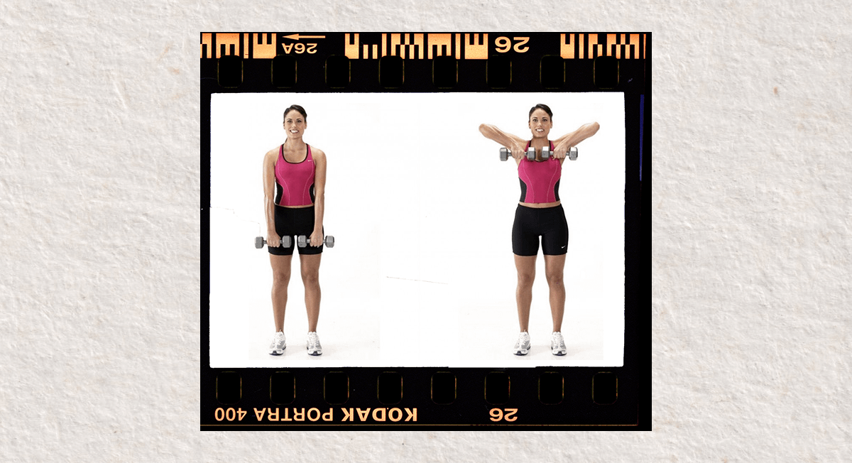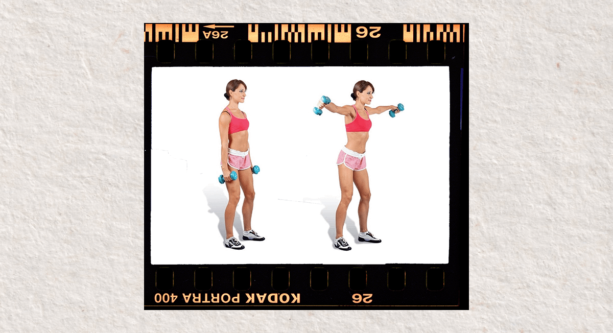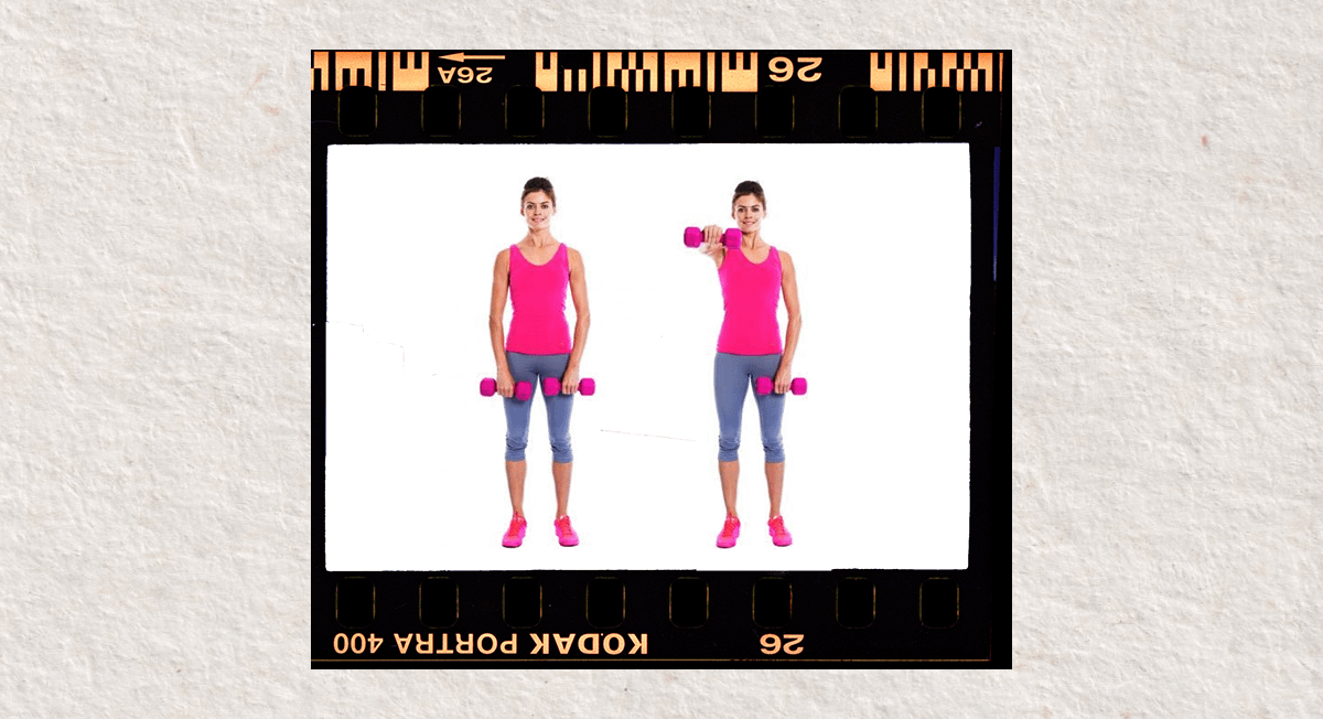 Простое, но эффективное упражнение помогает быстро привести руки в порядок и сделать плечи более привлекательными. Гантели можно заменить спортивными блинами или бутылками, наполненными водой.