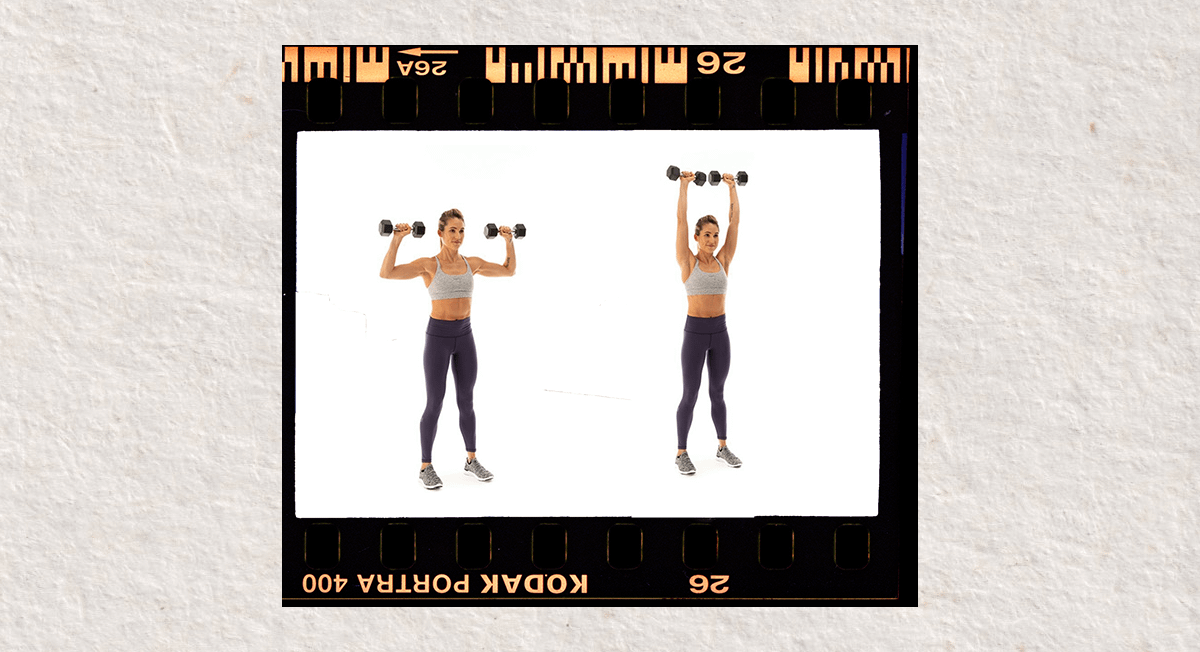 - из этой позиции разверни ладони наружу и выполни жим гантелей вверх;