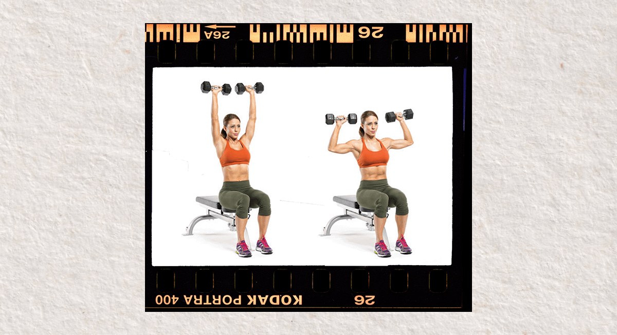 В процессе работают передние, средние и задние пучки дельтовидных мышц. Если есть возможность, выполняй упражнение на скамье с высокой спинкой, чтобы не включать посторонние мышцы.