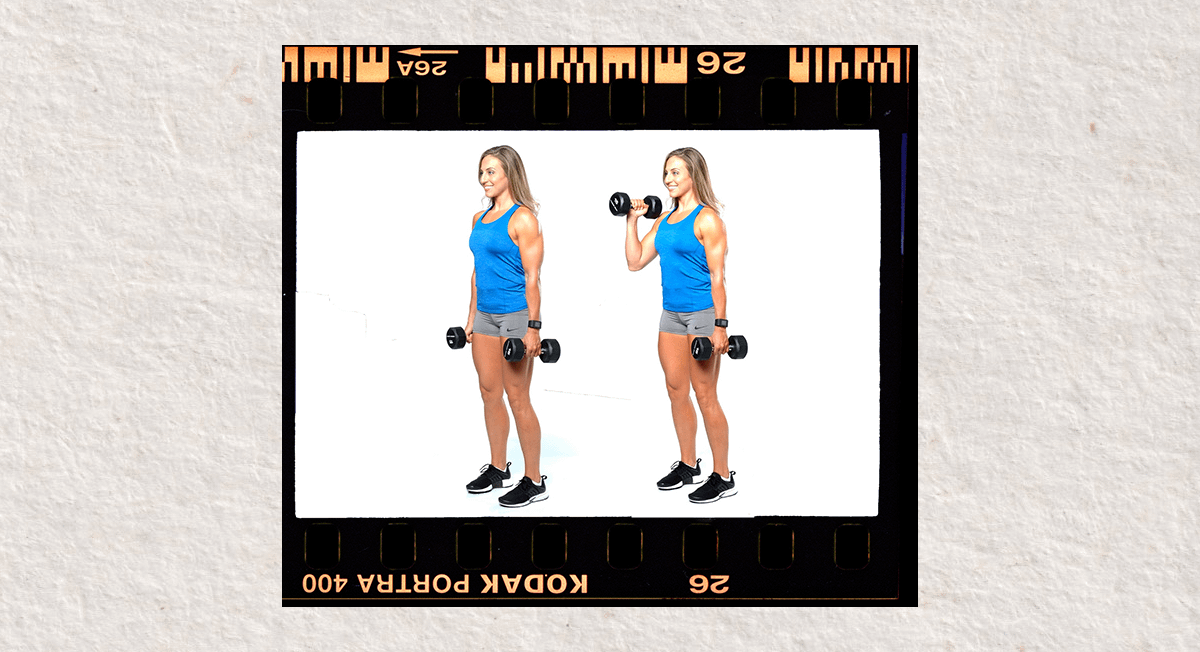 - согни локти под прямым углом, гантели размести на уровне глаз, ладони поверни к корпусу;