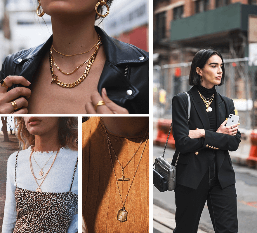 С одной стороны, обилие золотых украшений является антитрендом — они дешевят образ. С другой, на снимках стритстайлеров все чаще появляются многослойные подвески. Для эффектного образа сочетай их с повседневной одеждой: джинсами, толстовками, футболками, вязаными топами. Для вечернего выхода массивные ожерелья тоже подойдут, но в этом случае следи за тем, чтобы они не перетягивали на себя внимание с цельного образа.