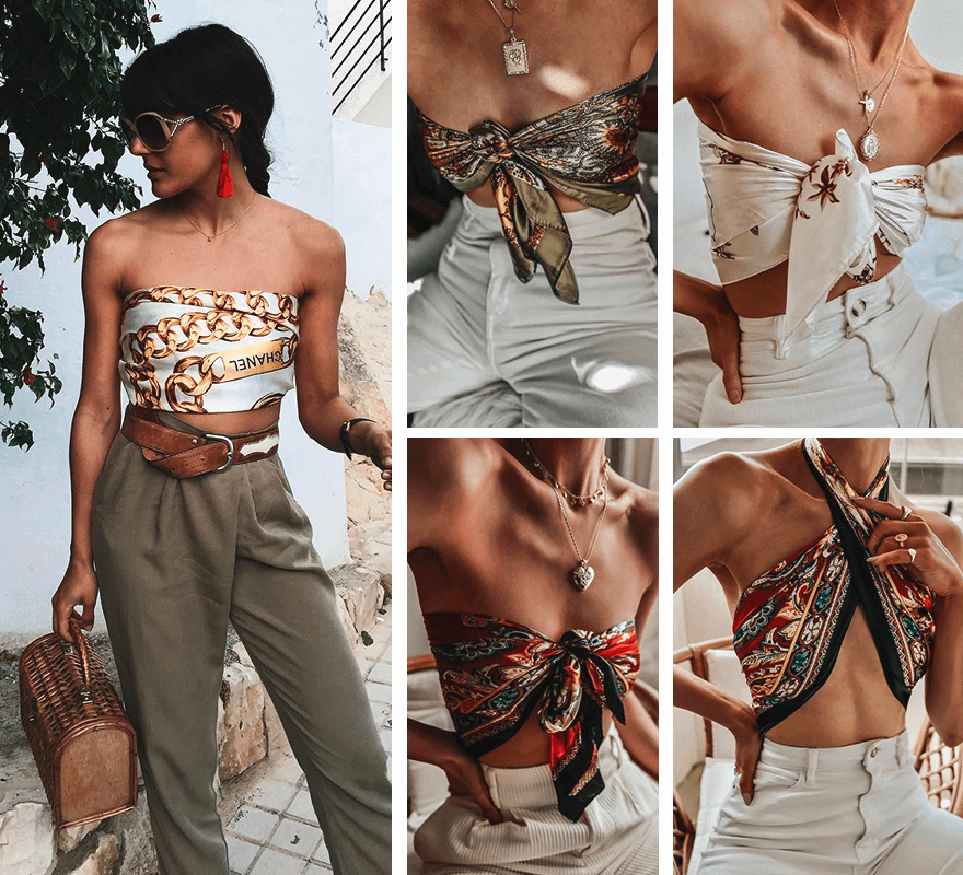Нужна теплая погода и крупный квадратный шелковый шарф — он найдется в любом магазине одежды. Сложи его по диагонали и завяжи на спине — получится топ без бретелей, который привнесет в образ непосредственность и расслабленность. Если боишься показаться вульгарной, комбинируй его с джинсовой оверсайз-курткой или рубашкой.