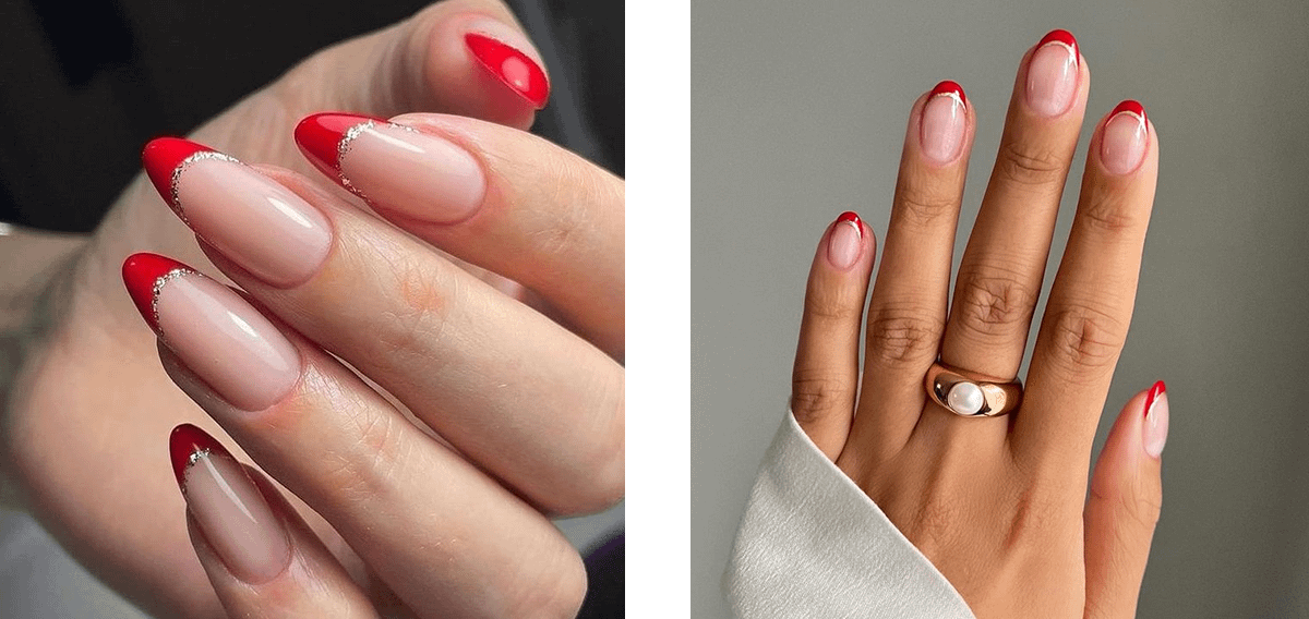 Если тебе нравится французский маникюр, но в то же время хочется попробовать что-то необычное, добавь ему цвета. Попроси мастера окрасить кончики ногтей в красный оттенок и добавить тонкую полосу из блесток.