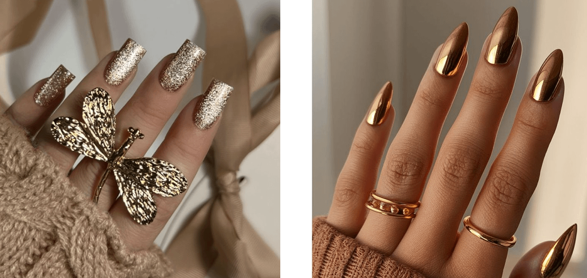 Кстати, если не очень любишь переливы блесток, а добавить сияния ногтям хочется, присмотрись к золотистому маникюру с эффектом металлик — он смотрится минималистично и дорого.
