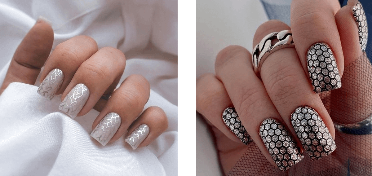Блестящий маникюр со стемпингом смотрится свежо и стильно. К тому же ты можешь выбрать любой рисунок — от замысловатых «сеток» до сложных узоров.