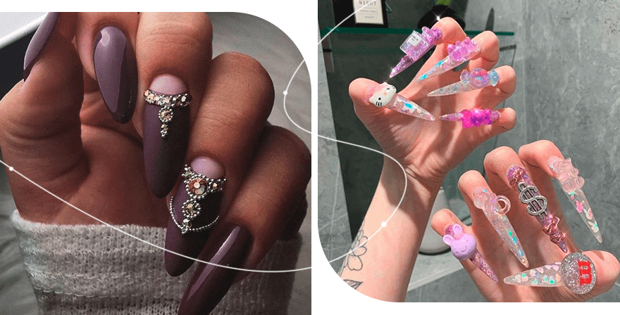Мода на длинные разноцветные ногти, украшенные всевозможными стразами и наклейками, появилась еще в начале 2000-х. Именно тогда женщины полюбили наращивание и старались сделать ногти более яркими и привлекающими внимание. В это же время популярность получила и 3D-лепка на ногтях. Чаще всего в качестве объемного украшения выбирали разнообразные цветы.
