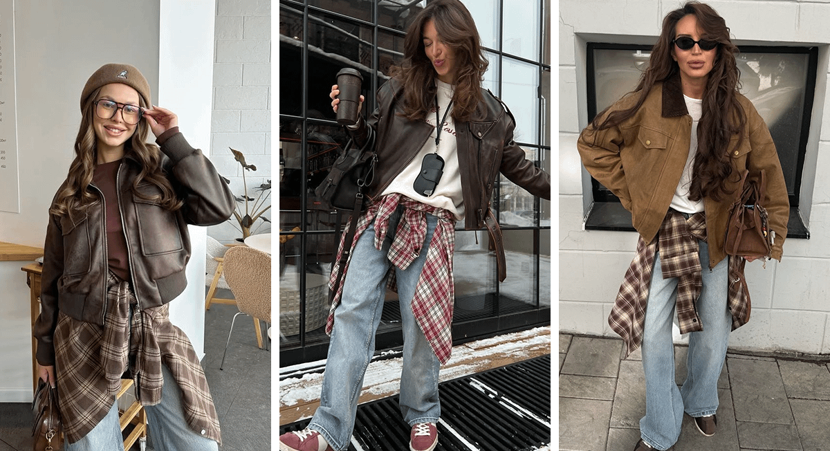 Надень кожаную или замшевую коричневую куртку, а под нее — однотонную футболку или лонгслив. Джинсы выбери прямые или чуть расклешенные, с необработанными краями. На поясе повяжи клетчатую рубашку в осенних оттенках: бежевом, терракотовом, хаки. Завершить образ можно кедами в винтажном стиле или ботинками со шнуровкой.