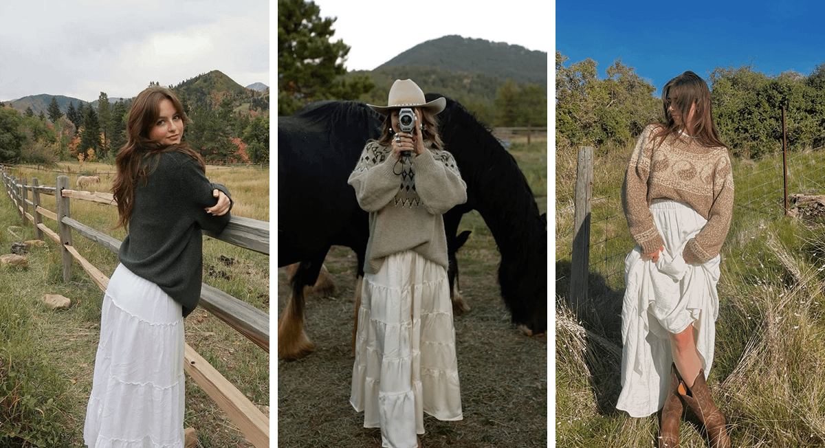 Этой осенью в числе модных трендов оказались и белые юбки, которые визуально напоминают подъюбники прошлых столетий. Вещь идеальна для создания лука в деревенском стиле — она отлично выглядит в сочетании с растянутым свитером, высокими сапогами и ковбойской шляпой.