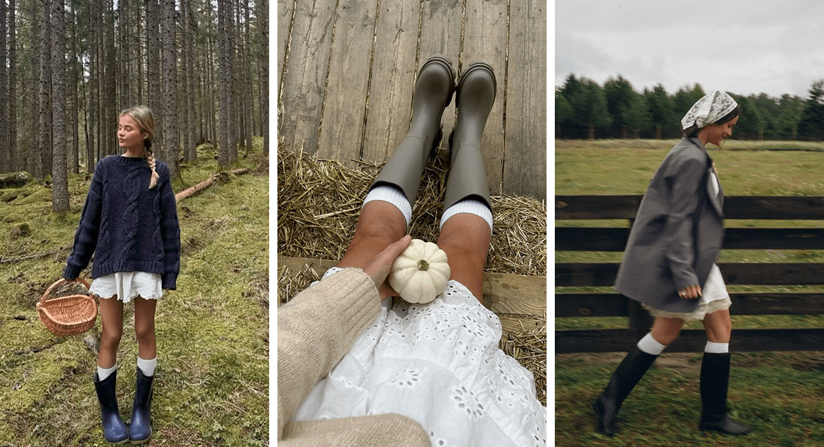 Если в шкафу завалялось белое платье мини или короткая юбка, надень ее, а сверху — широкий и длинный однотонный свитер. Не забудь о гетрах и высоких резиновых сапогах — этой осенью они снова в моде. На голову можешь повязать кружевную косынку — еще один тренд сезона.