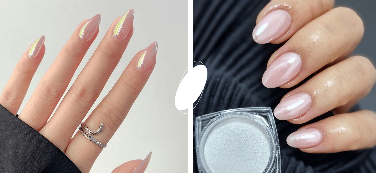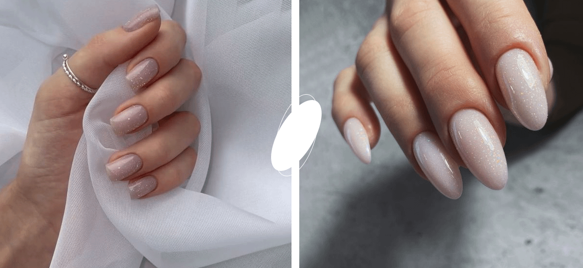 Выбери молочный, кремовый, белый или пудровый в качестве основы, а затем нанеси на него мерцающий верхний слой. Избегай крупных блесток и слишком ярких оттенков, чтобы маникюр подходил не только для праздника, но и для повседневных выходов.