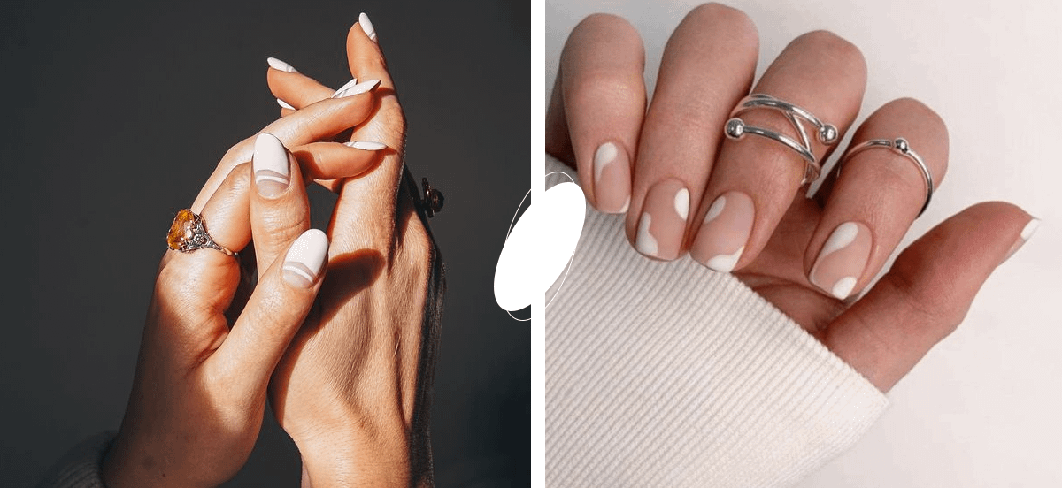 Можешь оставить пустое пространство у лунки ногтя в виде полос или придумать замысловатую форму «пустоты», сочетая ее с нюдовыми оттенками лака.