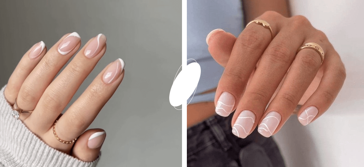 Ногти розового, молочного, кремового и других пастельных оттенков сами по себе смотрятся нейтрально и аккуратно. Но все же иногда хочется разнообразия — и в этом случае добавь к классическому маникюру ненавязчивый узор из произвольных тонких линий белого цвета.