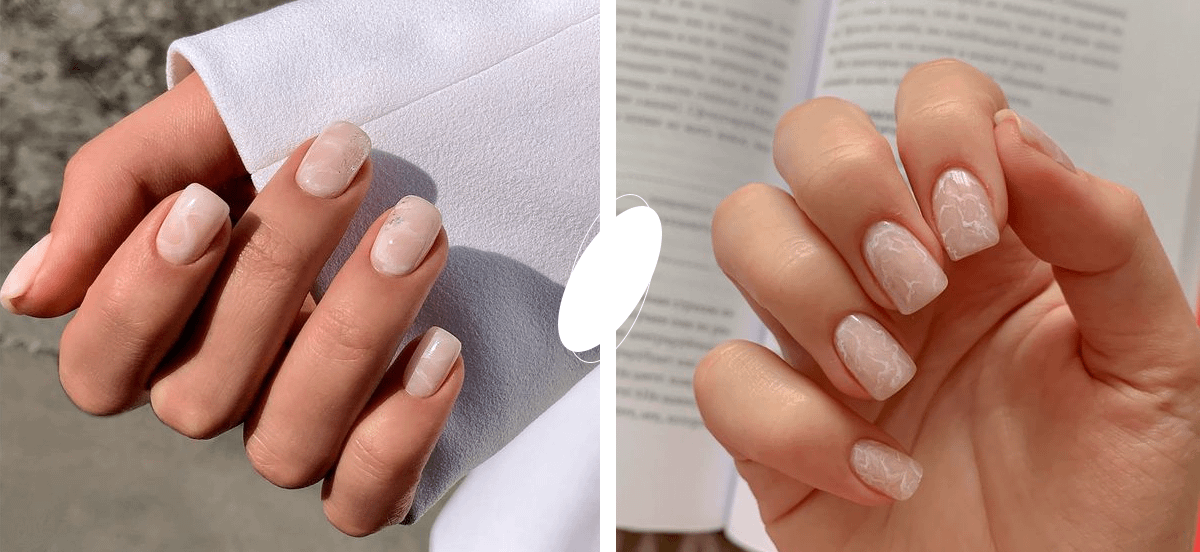 Ногти с эффектом мрамора смотрятся эффектно, но в то же время уместно. Важно лишь подобрать оттенок лака, который будет продолжением твоего тона кожи или походить на натуральный цвет ногтя.