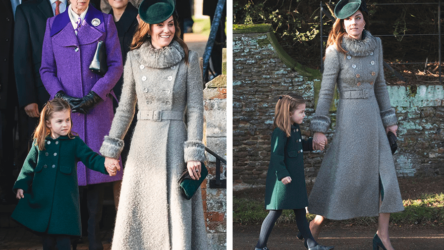В 2019 году герцогиня Кембриджская отдала предпочтение элегантному серому пальто длиной 7/8 от Catherine Walker, изумрудному фасинатору от Lock & Co и лодочкам в тон от Hatters и Emmy. Примечательно, что верхняя одежда Шарлотты сочеталась с аксессуарами ее матери — этим элементом парного образа, к слову, занимались Amaia Kids.