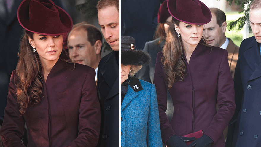 Тот же оттенок, что и Софи, в свое время выбирала Кейт, герцогиня Кембриджская, в 2011 году. Тогда она выбрала классический сливовый сюртук, дополнив его несколько более яркой шляпкой от Jane Corbett. Небольшой клатч, выполненный из того же материала, что и головной убор, как никогда приходился к месту.