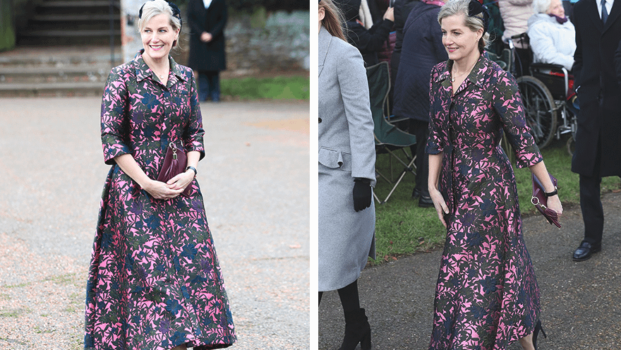 Наряд Софи, герцогини Уэссекской, так и навевает ассоциации с образами Хюррем Султан: для Рождества 2017 года она выбрала платье-пальто с силуэтом new look. Узор — дикий и вместе с тем нежный благодаря изображению тропических растений. Цвета — только самые сочные и ягодные. Аксессуары выгодно оттеняют главную деталь образа: в программе у нас сливовый клатч и лодочки цвета индиго.