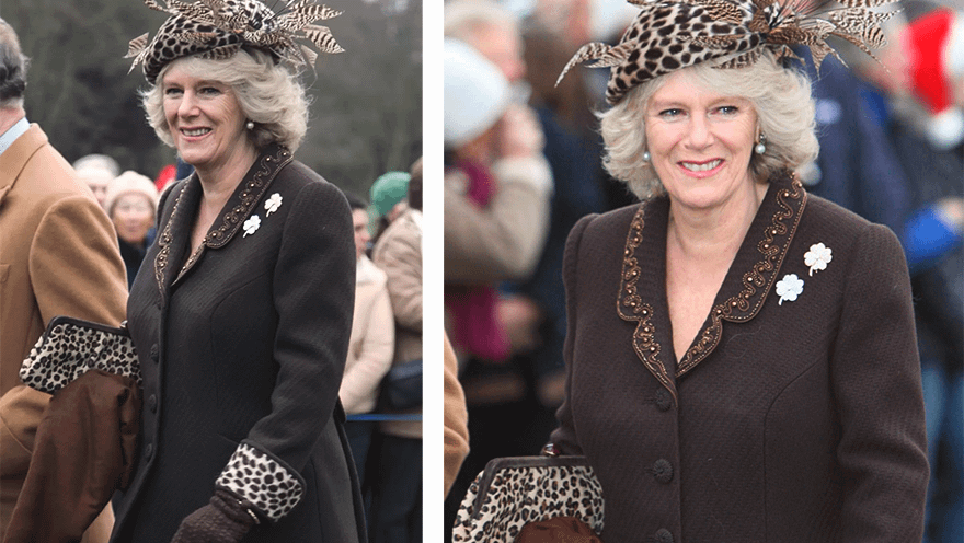 Образы Камиллы Паркер-Боулз поражают — вспомни ее строгое подвенечное платье, расшитое золотом, и шляпку с мерцающими перьями от Philip Treacy, выбранную в качестве аксессуара. Для дебютного посещения Рождественской службы в качестве супруги принца она выбрала темное пальто с леопардовыми манжетами, подобрав к ним клатч и шляпку с таким же принтом. К слову, головной убор также украшали перья — на этот раз совиные, в тон образу.