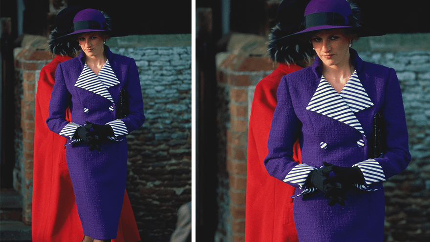 Уже через 8 лет, в 1989-м, Диана отпраздновала Рождество в платье-пальто глубокого фиолетового цвета. Лацканы и манжеты украшала монохромная полоска — с такой смесью Диана «украла» внимание к своей персоне со стороны журналистов задолго до «платья мести», надетого ею в 1994-м.