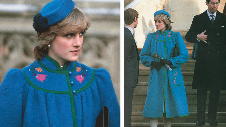 В 1981 году принцесса Диана была еще далека от образа femme fatale — вступая в брак с принцем Чарльзом, она отдавала предпочтение приглушенным оттенкам и воздушным силуэтам. Так, будучи беременной Уильямом, Леди Ди выбрала пальто с рукавами-фонариками, окрашенное в васильковый цвет и расшитое гладью. Аксессуаром служила шляпка-таблетка в тон верхней одежде.