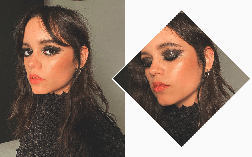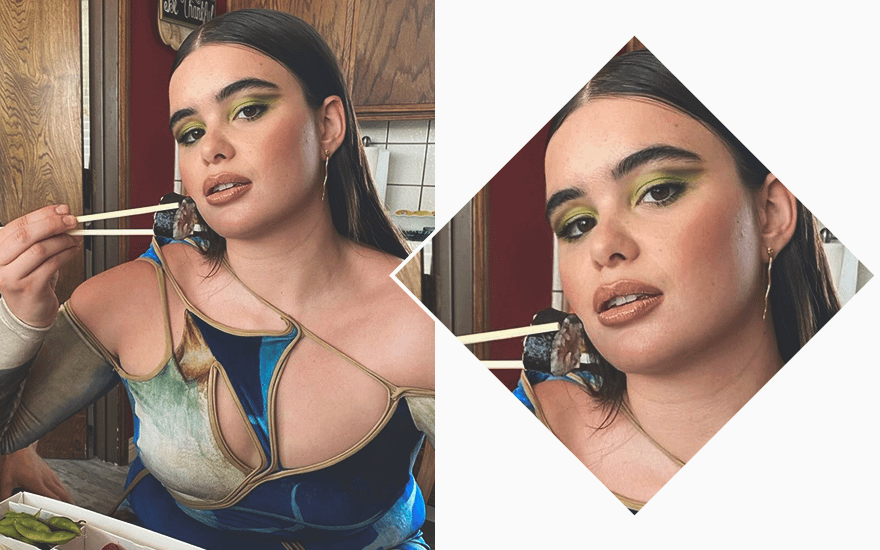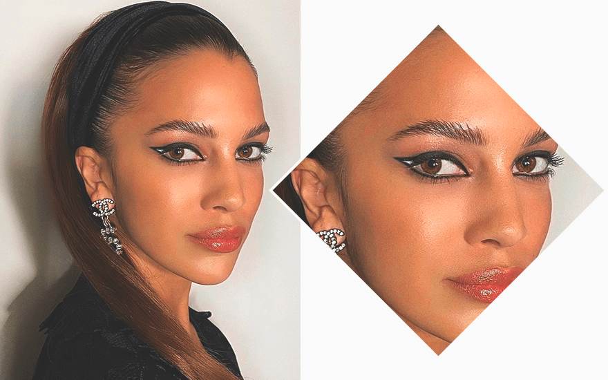 Чтобы повторить ее макияж, нанеси тон, затем добавь румян на щеках и веках, после чего выдели внутренний угол глаза тенями оранжевого цвета, закрась верхнее межресничное пространство легким кайалом и не забудь про тушь.