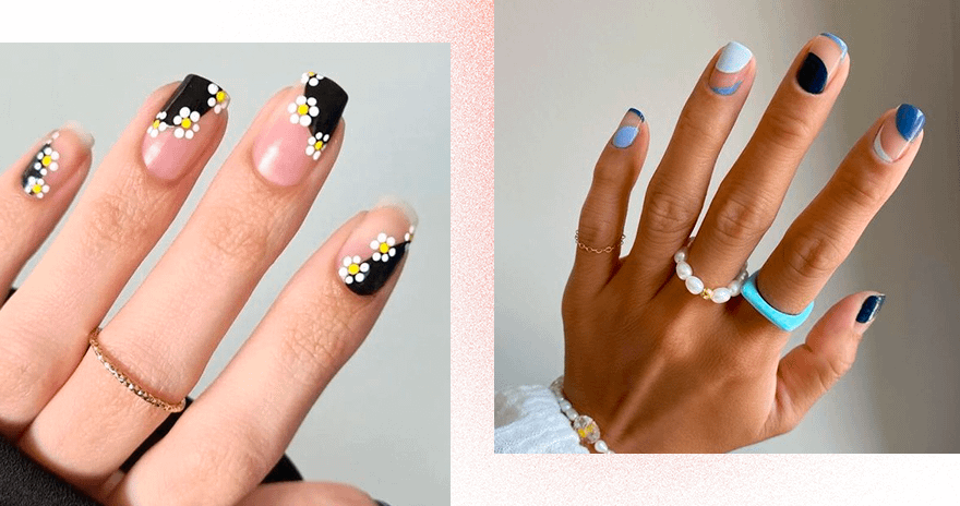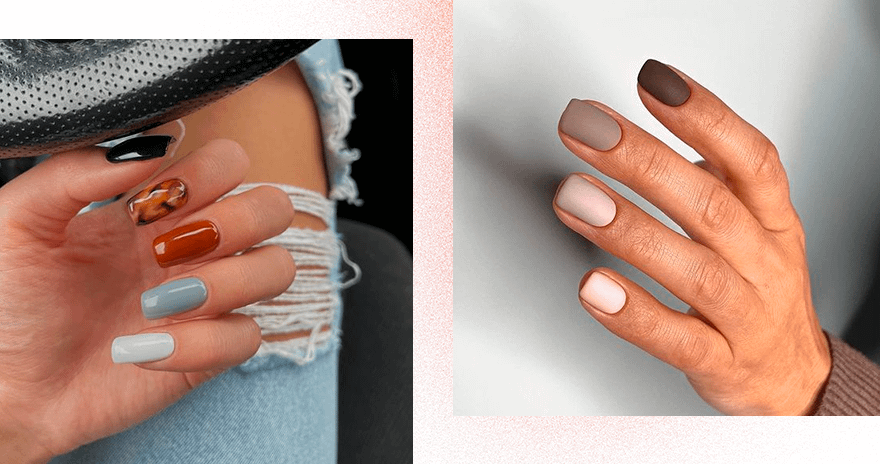 Простой и в то же время стильный маникюр с разноцветными ногтями помогает сделать красивый акцент и добавить образу игривости. Лучше всего выбирать матовое покрытие, особенно актуальное в этом сезоне. Также можешь чередовать его с глянцевым, чтобы создать стильный дизайн.