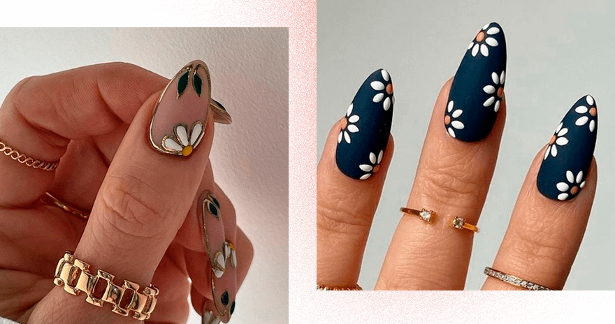 Женственный маникюр с цветами — еще один тренд осени. Выбирай оливковый, кирпичный, розовый, пастельный голубой, темно-зеленый и синий оттенки, которые будут самыми актуальными в этом сезоне. Цветы могут быть минималистичными и простыми или, наоборот, детализированными и объемными.