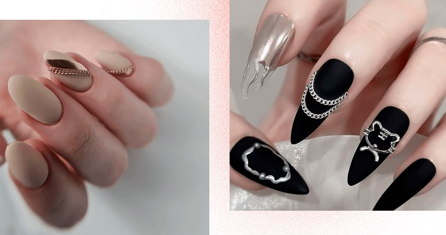 В тренде не только металлические оттенки лака для ногтей, но и маникюрные украшения. Например, маникюр с цепочками, подвесками, объемным декором в этом оттенке. Еще одна модная тенденция, которую стоит попробовать, — пирсинг для ногтей.