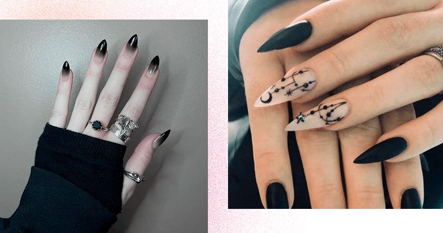 Готкор — это эстетика, сочетающая в себе готику и женственность. Оттенки черного и других темных цветов, вкрапления красного, смелые слайдеры и дизайн, острая форма — вот основные черты трендового маникюра в этом стиле. Покрытие может быть как глянцевым, так и матовым, что особенно актуально в этом сезоне.