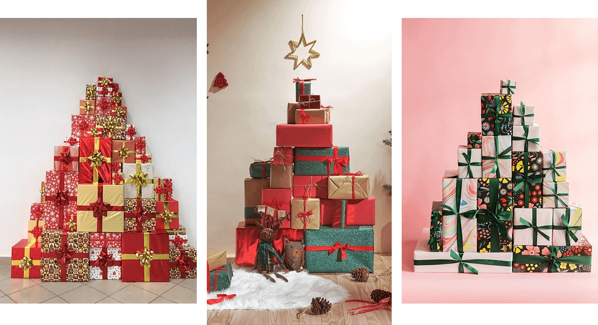 Необязательно использовать подарочные коробки, которые подготовила для друзей и родственников. Сделай несколько муляжей разных размеров, чтобы было удобно соорудить стильную елку. Сложи коробки так, чтобы внизу оказались самые крупные, а наверху — маленькие. Укрась их лентами, игрушками и гирляндой. Чтобы конструкция была надежной, закрепи коробки между собой двусторонним скотчем или клеем.